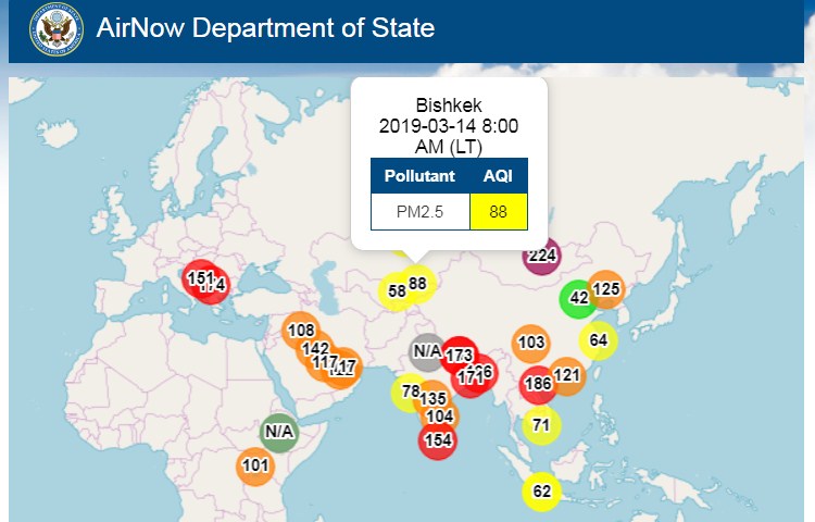 Посольство США в Кыргызстане также установило датчик, измеряющий уровень загрязнения воздуха. Информация обновляется ежечасно.