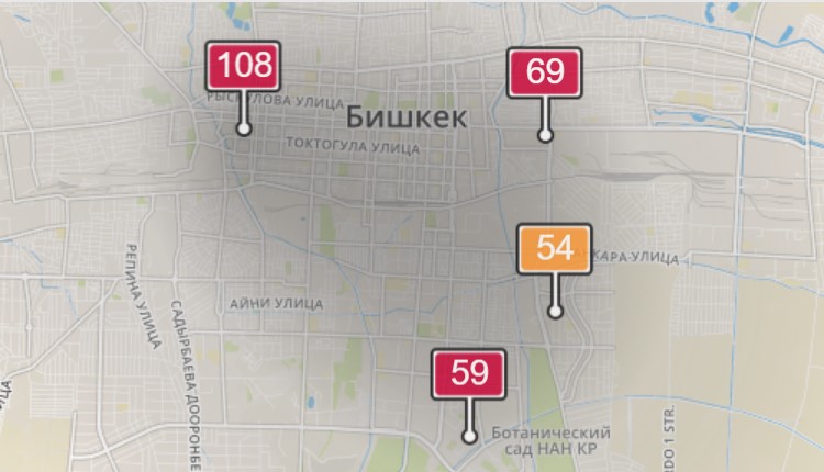 1. В районе улиц Бейшеналиевой/Токтогула. Уровень загрязнения превышен в 1,62 раза: PM2.5 среднесуточный — 57 мкг/м³, на момент измерения — 108 мкг/м³.