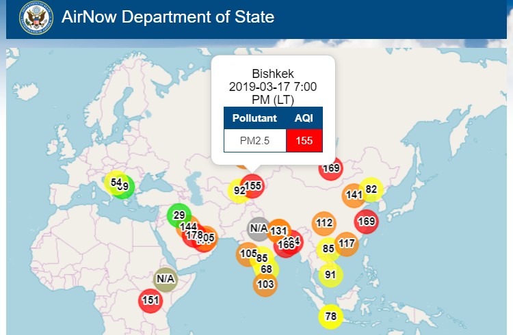 Посольство США в Кыргызстане также установило датчик, измеряющий уровень загрязнения воздуха. Информация обновляется ежечасно.