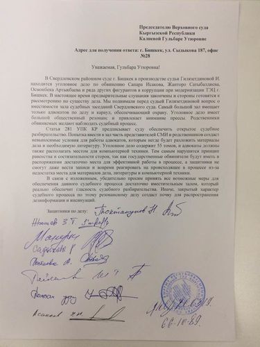 Адвокаты обвиняемых по делу о модернизации Бишкекской ТЭЦ обратились к председателю Верховного суда с просьбой обеспечить открытость и гласность процесса при рассмотрении по существу. Об этом сообщил адвокат бывшего премьер-министра страны Сапара Исакова Нурбек Токтакунов.