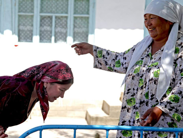 На Иссык-Куле поклоны могут длиться месяцами и годами, и не только в доме, но и на улице при встрече с родными мужа. Это считается показателем уважения к старшим. Можно встретить на улице даже пожилую женщину, делающую поклон.