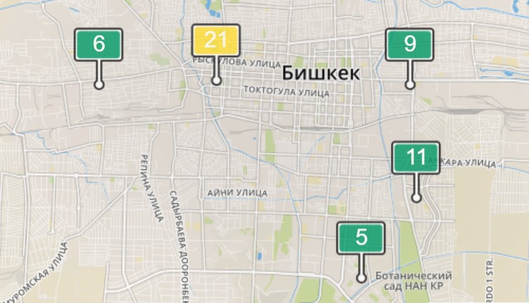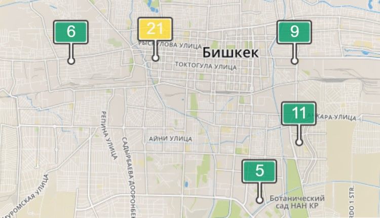 2. В районе улиц Бейшеналиевой/Токтогула. Уровень загрязнения не превышен: PM2.5 среднесуточный — 33 мкг/м³, на момент измерения — 21 мкг/м³.