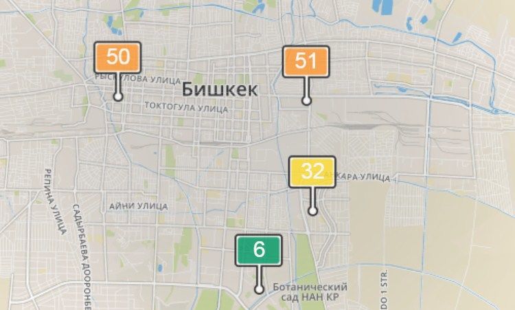 1. В районе улиц Бейшеналиевой/Токтогула. Уровень загрязнения не превышен: PM2.5 среднесуточный — 34 мкг/м³, на момент измерения — 50 мкг/м³.