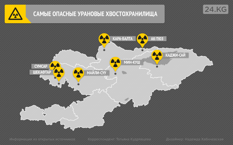 Хвостохранилища разбросаны практически по всему Кыргызстану. Но большая часть, в том числе и самые опасные объекты, — на юге страны. На сегодня в стране есть пять наиболее сложных объектов бывшего уранового наследия, где хранится большая часть отработанной урановой руды.