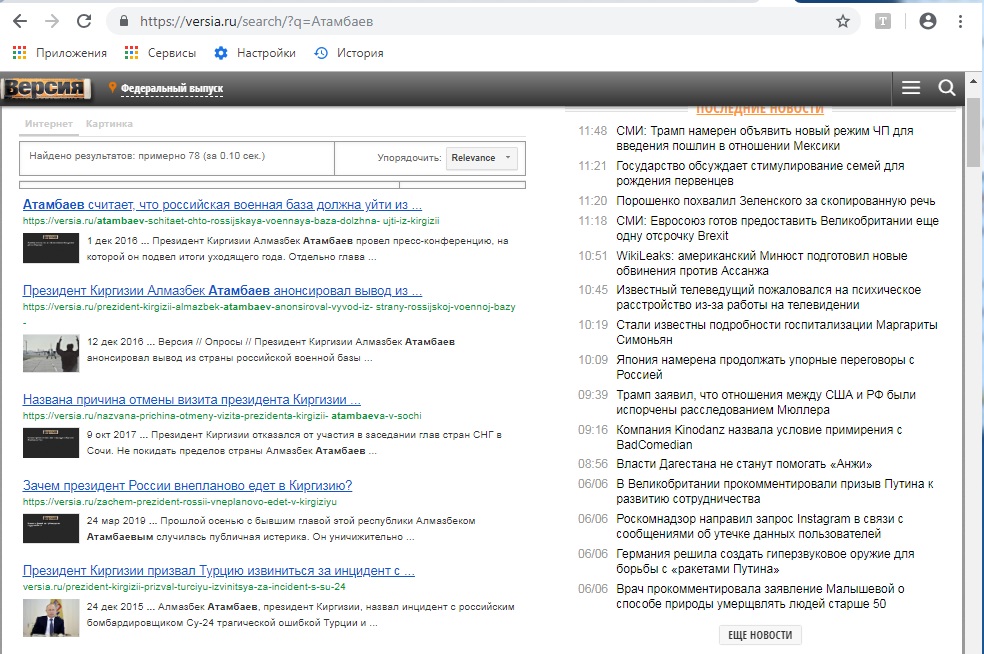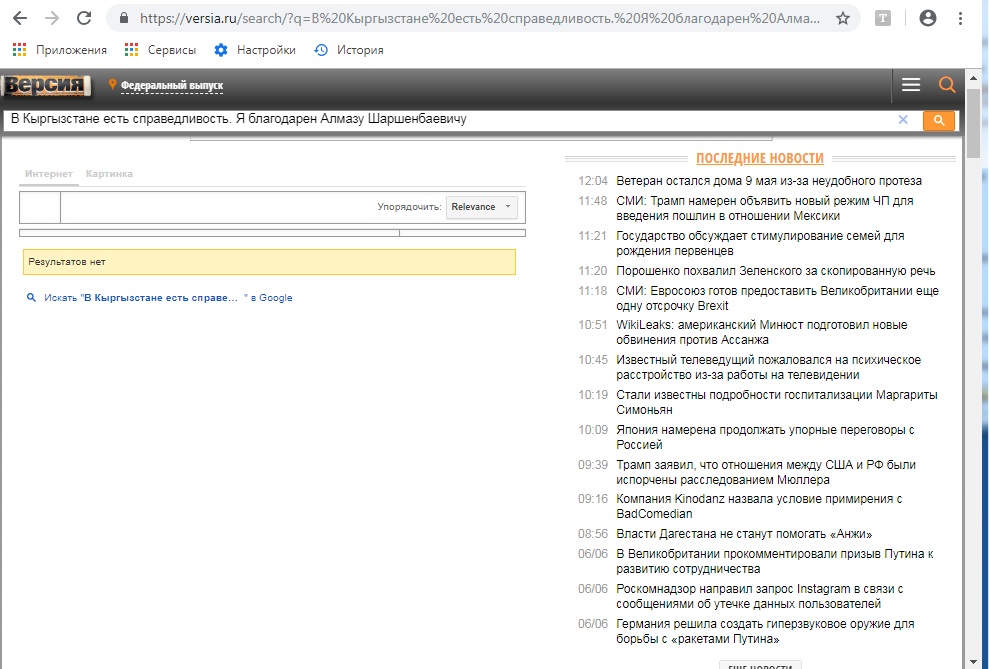 Кроме того, если ввести адрес, который отображен на скриншоте на сайте «Жанырык» https://kavkaz.versia.ru/aziz-batukaev/v-kyrgyzstane-est-spravedlivost-ya-blogadaren-almazu, в строку поиска, результат показывает, что такой публикации на сайте нет.
