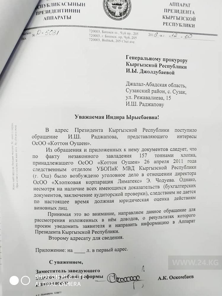 По документам исполнительным директором ОсОО «Коттон Оушен» является Фируза Ибрагимова. В отношении нее возбуждено уголовное дело по факту мошенничества. Подтверждающие документы будут представлены дополнительно, заявили в Минсельхозе.