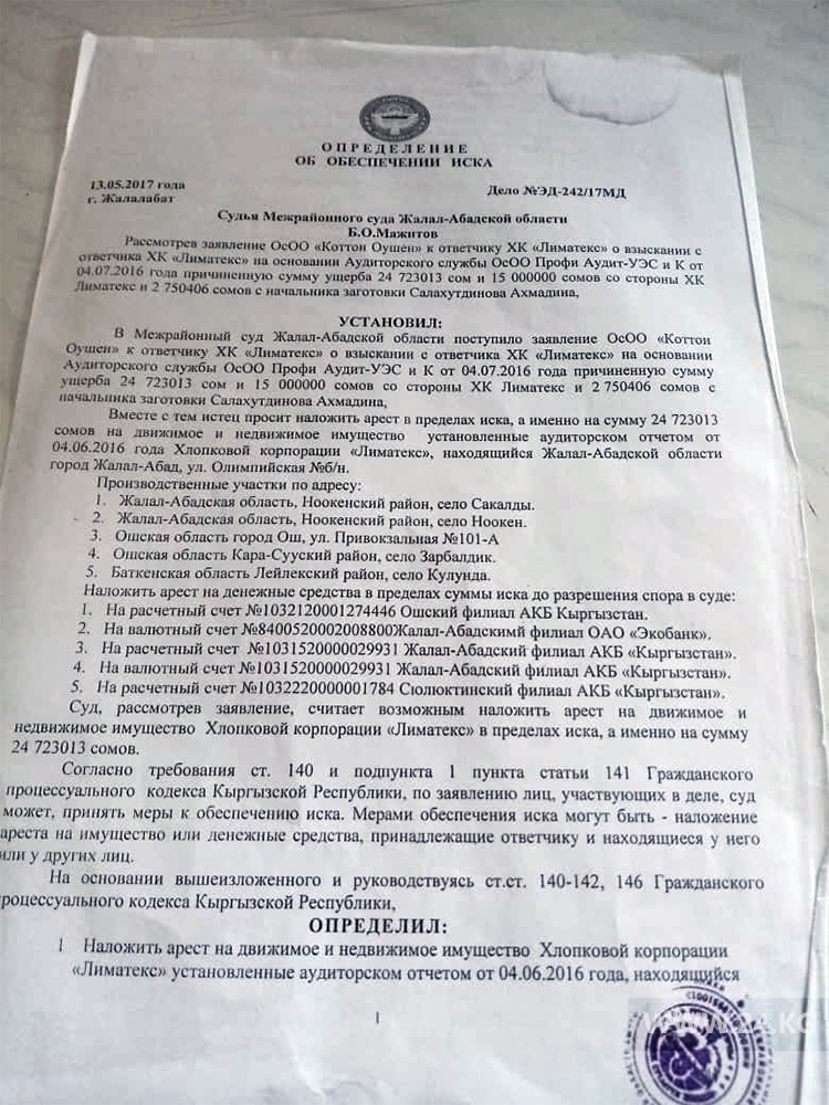 В Министерстве сельского хозяйства пояснили, что по данному факту с февраля 2011 года шли следственные мероприятия, по результатам которых Верховным судом КР вынесено постановление от 12 июля 2019 года об отказе в удовлетворении иска ОсОО «Коттон Оушен». Постановление вступает в законную силу с момента оглашения, является окончательным и обжалованию не подлежит.