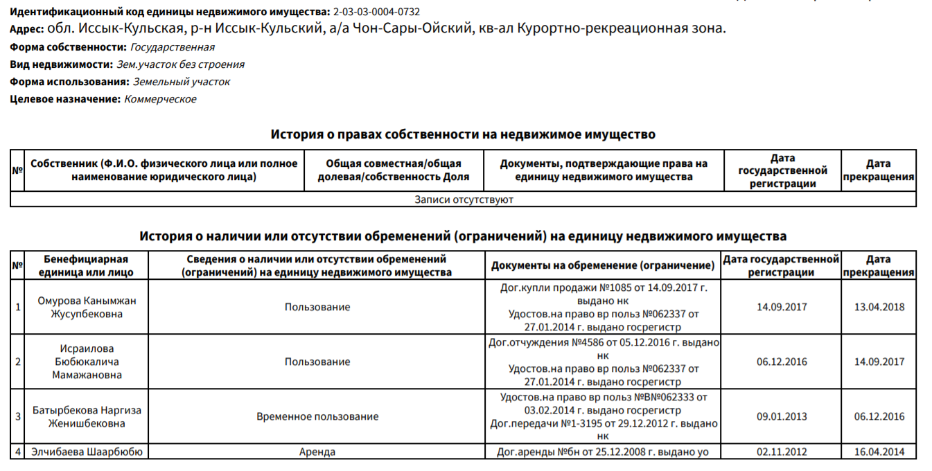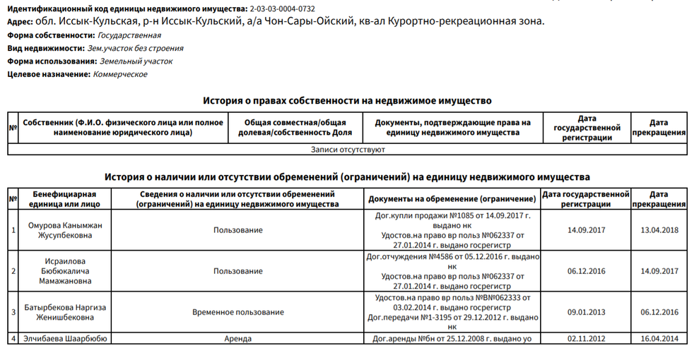 Участок в 188 квадратных метров в курортной зоне в Чон-Сары-Ойском айыльном округе принадлежал Бюбюкаличе Исраиловой. 22 мая 2017 года она передает его во временное пользование брату Рената Тулебердиева Асхату. Через полгода он оформляет договор дарения на их мать Канымжан Омурову. А после опять же договором дарения участок переоформляется на ее племянника Жусупбекова Бактыбека Койчуевича.