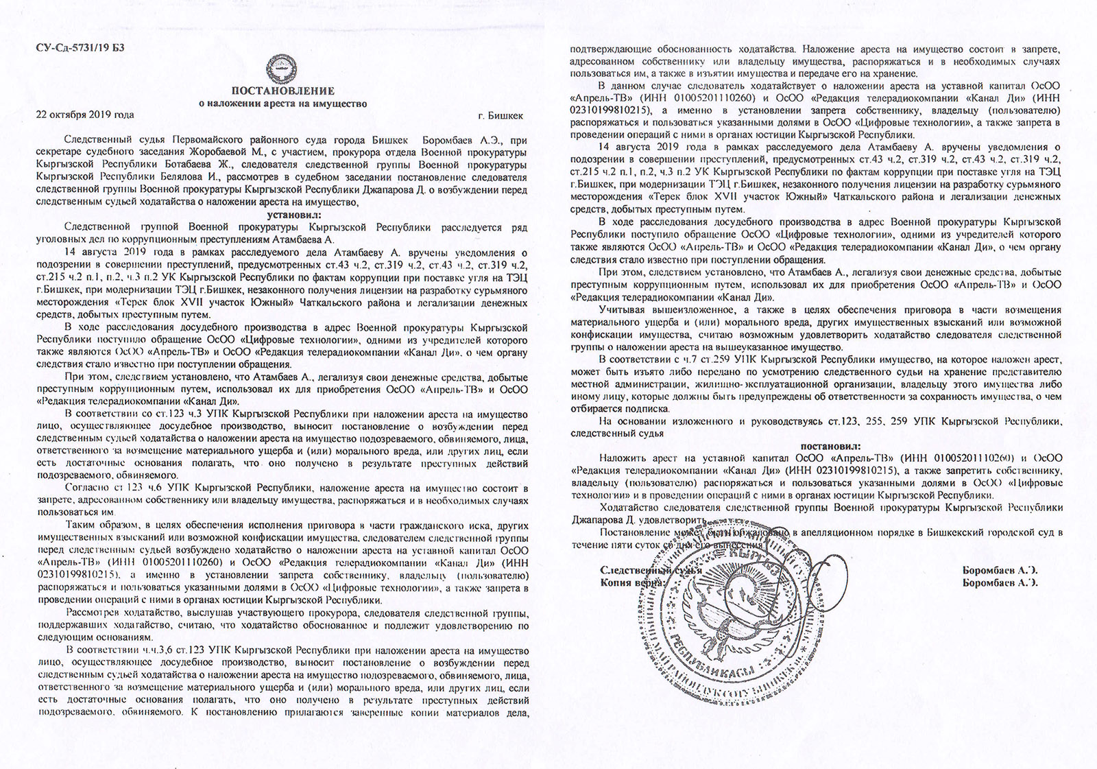 Первомайский районный суд под председательством Абдуразака Боромбаева поддержал заключение Военной прокуратуры и вынес решение об аресте доли телеканала «Апрель» в ОсОО «Цифровые технологии». Об этом 24-kg.com рассказал генеральный директор «Апрель ТВ» Дмитрий Ложников.