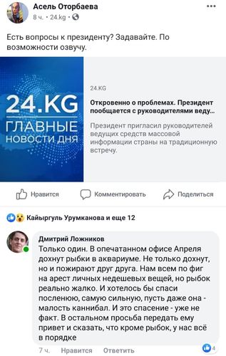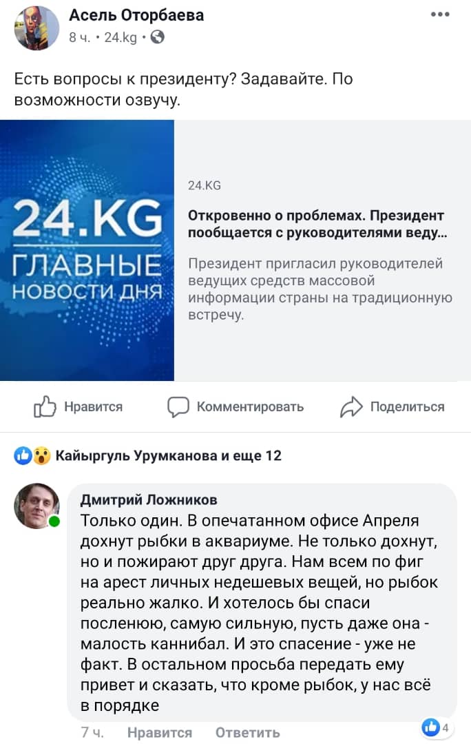 Отметим, что за несколько часов до этого директор нашего информагентства Асель Оторбаева опубликовала на своей странице в социальной сети пост с призывом задавать вопросы президенту. Сооронбай Жээнбеков проведет встречу с руководителями ведущих СМИ КР. Представителей «Апрель ТВ» на эту встречу не позвали. Директор телеканала Дмитрий Ложников попросил задать главе государства всего один вопрос — про аквариумных рыбок.