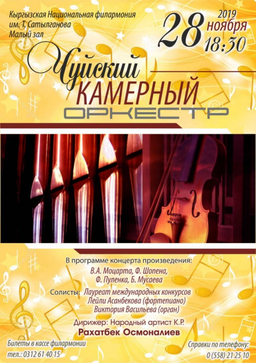 Вы услышите музыкальные шедевры мастеров разных эпох в исполнении Чуйского камерного оркестра — от эпохи Барокко до мастеров современности. Дирижер — народный артист КР Рахатбек Осмоналиев.