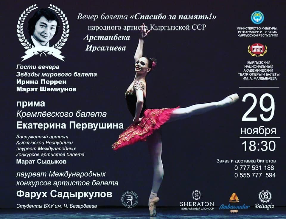 Концерт посвящен легендарному танцовщику, артисту кино, народному артисту КР Арстанбеку Ирсалиеву. На вечер приглашены звезды мирового балета, премьеры Михайловского театра Ирина Перрен и Марат Шемиунов, прима Кремлевского балета Екатерина Первушина, премьер «Астана опера» Еркин Рахматтулаев.