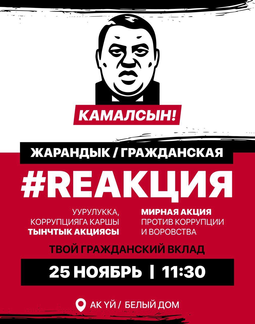 Мирные акции против коррупции пройдут в Бишкеке и Караколе. Митинг запланирован на 25 ноября, начало в 11.30, в столице Кыргызстана — у здания «Белого дома», в Караколе — возле обладминистрации.
