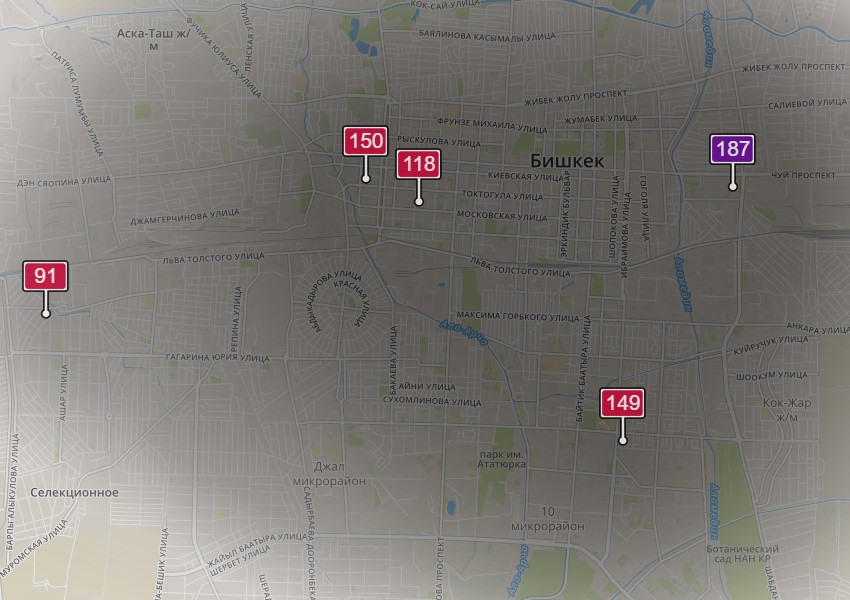 - в районе улиц Бейшеналиевой/Токтогула. Уровень загрязнения превышен в 12,4 раза: PM2.5 среднесуточный — 435 мкг/м³, на момент измерения — 150 мкг/м³;