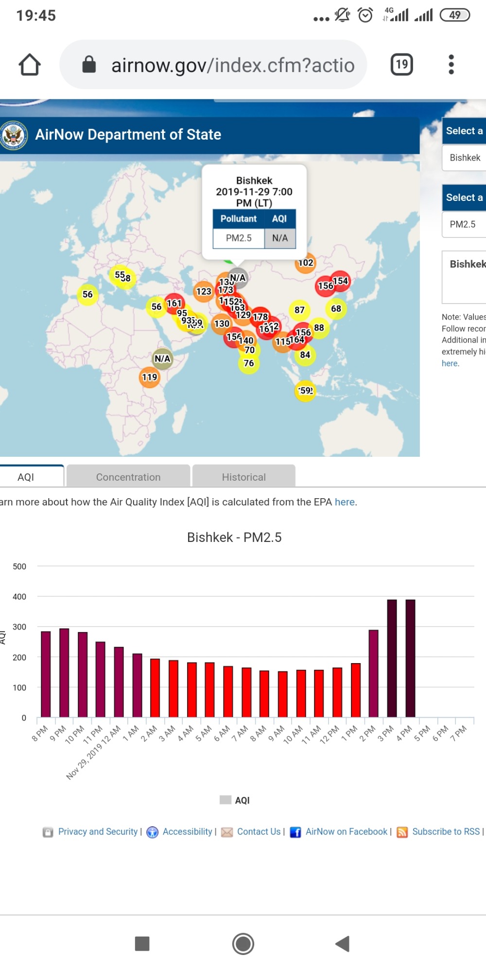 Посольство США в Кыргызстане также установило датчик. Он показывает индекс качества воздуха в режиме онлайн. Последние три часа информация не обновляется. Но в течение дня уровень индекса не опускался ниже красной, опасной для здоровья отметки.