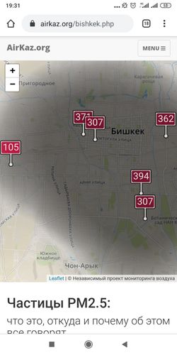 - жилмассив «Ак-Орго». Уровень загрязнения превышен в три раза: PM2.5 среднесуточный — 105 мкг/м³, на момент измерения — 105 мкг/м³.