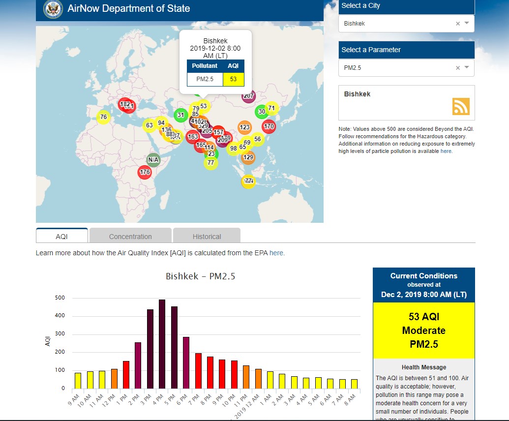 Посольство США в Кыргызстане также установило датчик. Он показывает индекс качества воздуха в режиме онлайн. Информация обновляется ежечасно.