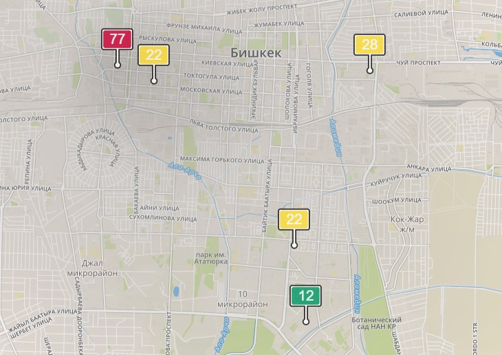 - в районе улиц Бейшеналиевой/Токтогула. Уровень загрязнения превышен в 2,54 раза: PM2.5 среднесуточный — 89 мкг/м³, на момент измерения — 77 мкг/м³;