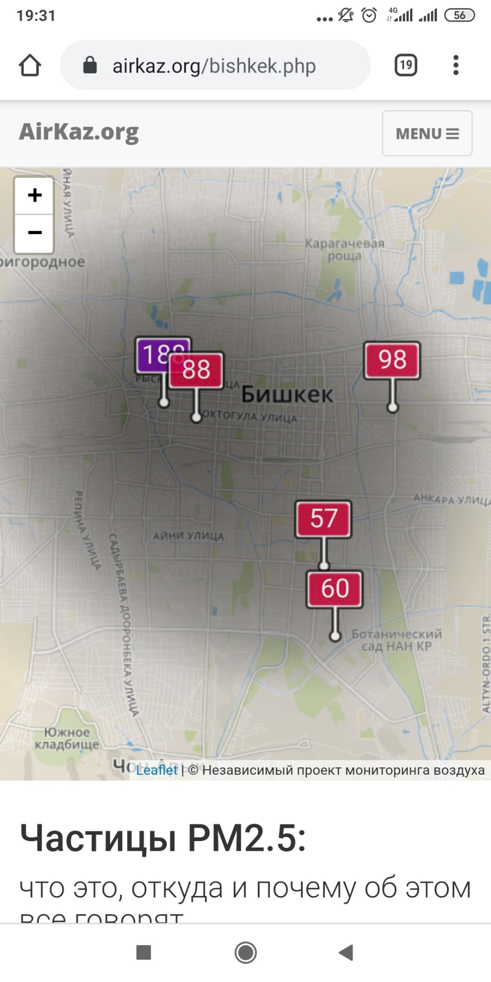 - в районе улиц Бейшеналиевой/Токтогула. Уровень загрязнения превышен в 2,11 раза: PM2.5 среднесуточный — 74 мкг/м³, на момент измерения — 188 мкг/м³;