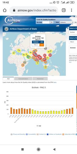 Посольство США в Кыргызстане также установило датчик. Он показывает индекс качества воздуха в режиме онлайн. Информация обновляется ежечасно.