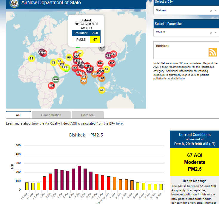 Посольство США в Кыргызстане также установило датчик. Он показывает индекс качества воздуха в режиме онлайн. Информация обновляется ежечасно.