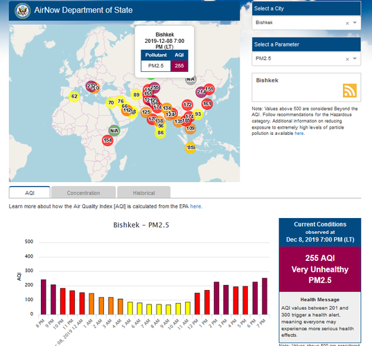 Посольство США в Кыргызстане также установило датчик. Он показывает индекс качества воздуха в режиме онлайн. Информация обновляется ежечасно.