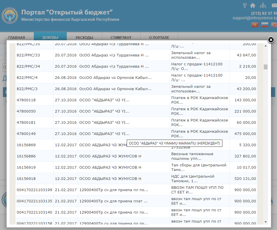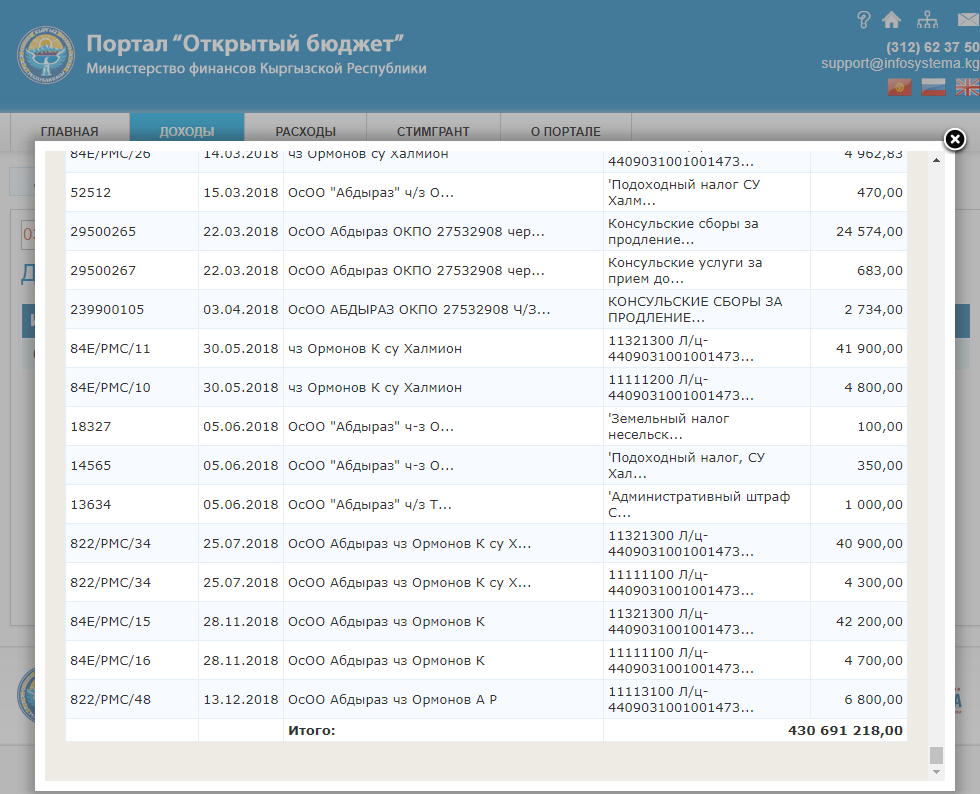 С 2013 по 2018 год ОсОО «Абдыраз» заплатило налогов на 430 миллионов 691,2 тысячи сомов.