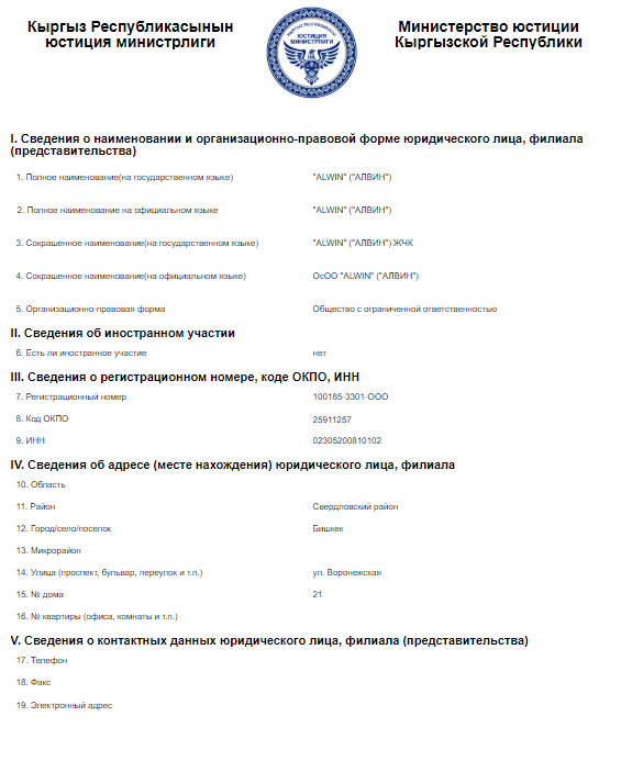 ОсОО ALWIN («АЛВИН») учредил в мае 2008-го и с тех пор руководит им Касым Курбанов. Чем занимается организация, неясно, как и то, сколько налогов она уплатила за 11 лет работы. Данных о перечислении средств в бюджет нет.