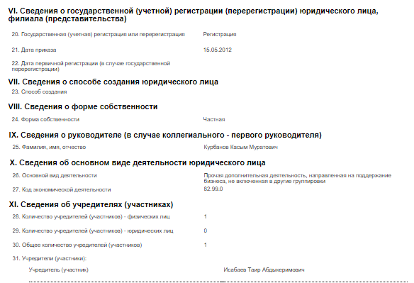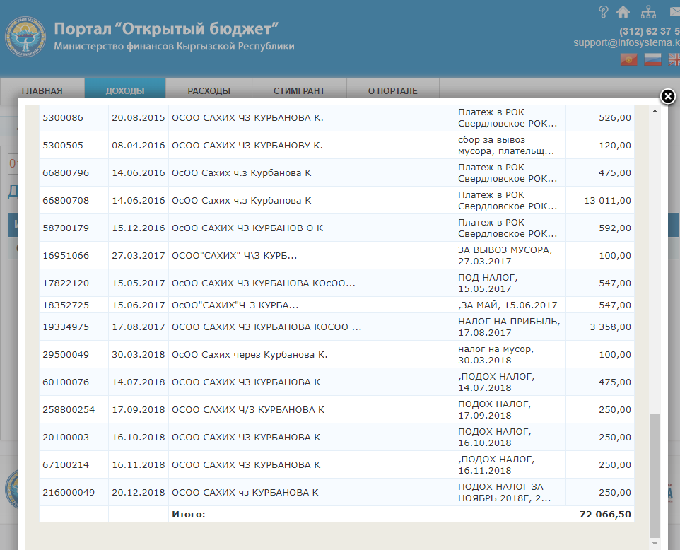 ОсОО «Сахих» создал в мае 2012-го Таир Исабаев, а руководителем назначил Касыма Курбанова. Фирма занимается прочей дополнительной деятельностью, направленной на поддержание бизнеса. Она исправно платит налоги. Правда, перечисления с 2013 по 2018 год составили лишь 72 тысячи сомов. Деньги перечислены для оплаты подоходного налога, налогов на прибыль, с продаж и сбора за вывоз мусора.