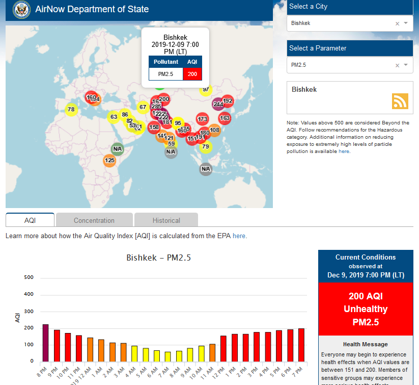 Посольство США в Кыргызстане также установило датчик. Он показывает индекс качества воздуха в режиме онлайн. Информация обновляется ежечасно.