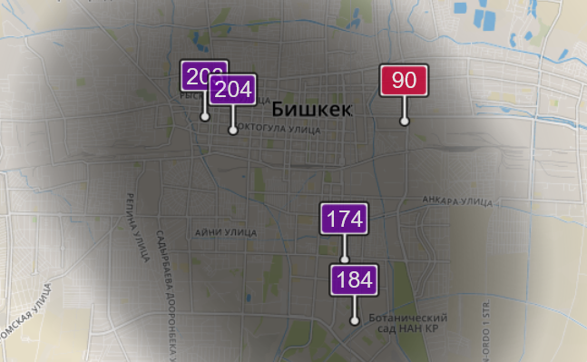 - в районе улиц Бейшеналиевой/Токтогула. Уровень загрязнения превышен в 5,17 раза: PM2.5 среднесуточный — 181 мкг/м³, на момент измерения — 203 мкг/м³;