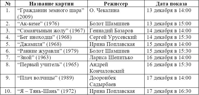 Все ценители творчества писателя могут посмотреть на большом экране фильмы, ставшие классикой и культурным достоянием Кыргызской Республики.
