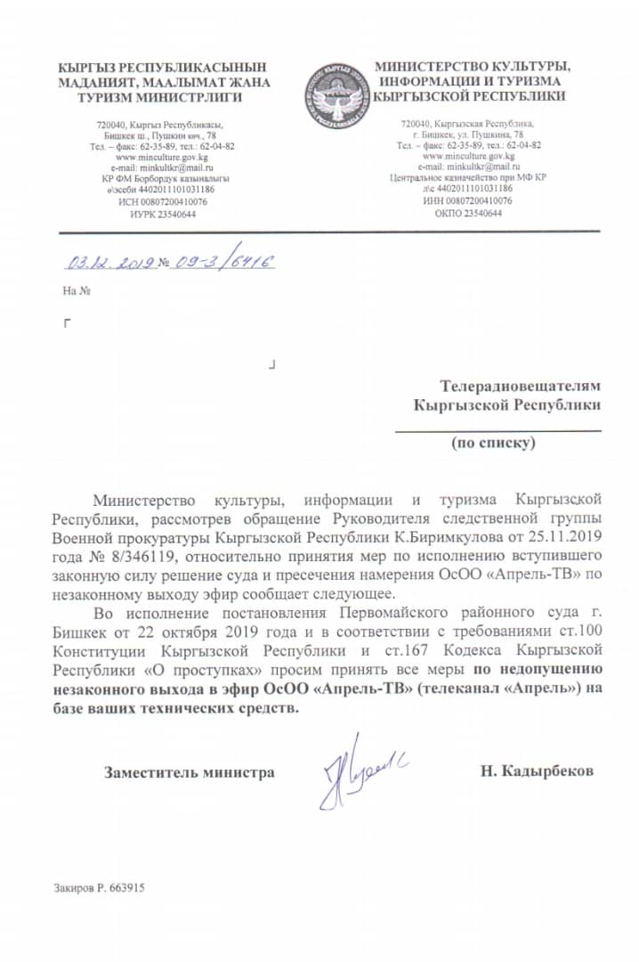 Напомним, эфир телеканала прервали 7 августа 2019 года во время штурма дома бывшего президента Алмазбека Атамбаева в Кой-Таше. Следственные органы 9 августа арестовали здание «Медиа Форума», где расположены штаб СДПК и офис телекомпании. Таким образом, работа «Апреля» была практически заблокирована.
