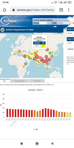 Посольство США в Кыргызстане также установило датчик. Он показывает индекс качества воздуха в режиме онлайн. Информация обновляется ежечасно.