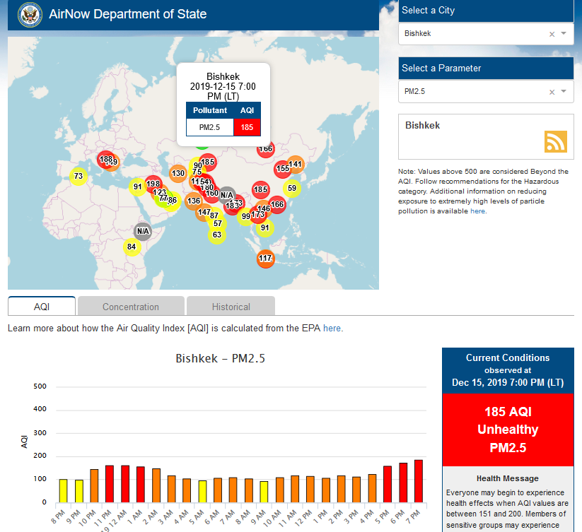 Посольство США в Кыргызстане также установило датчик. Он показывает индекс качества воздуха в режиме онлайн. Информация обновляется ежечасно.