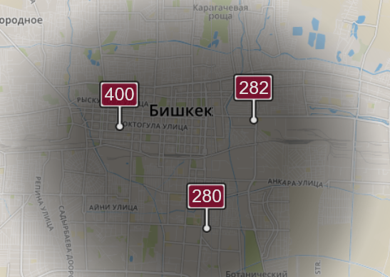 - в районе улиц Московской/Уметалиева. Уровень загрязнения превышен в 8,3 раза: PM2.5 среднесуточный — 291 мкг/м³, на момент измерения — 400 мкг/м³;