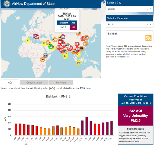 Посольство США в Кыргызстане также установило датчик. Он показывает индекс качества воздуха в режиме онлайн. Информация обновляется ежечасно. Отметим, монитор качества воздуха дипмиссии зарегистрирован Кыргызстандартом.