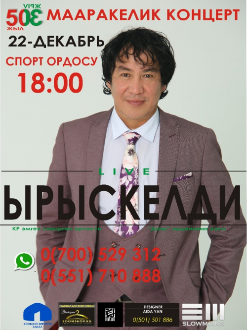 Концерт посвящен 50-летию певца и 30-летию творческой деятельности. Прозвучат полюбившиеся хиты. Гости концерта солист группы «Инсан» Тынай Алыбаев, Курал Чокоев, Ислам Акматов, Бек Исраилов, Азат Раимбердиев, Баястан.