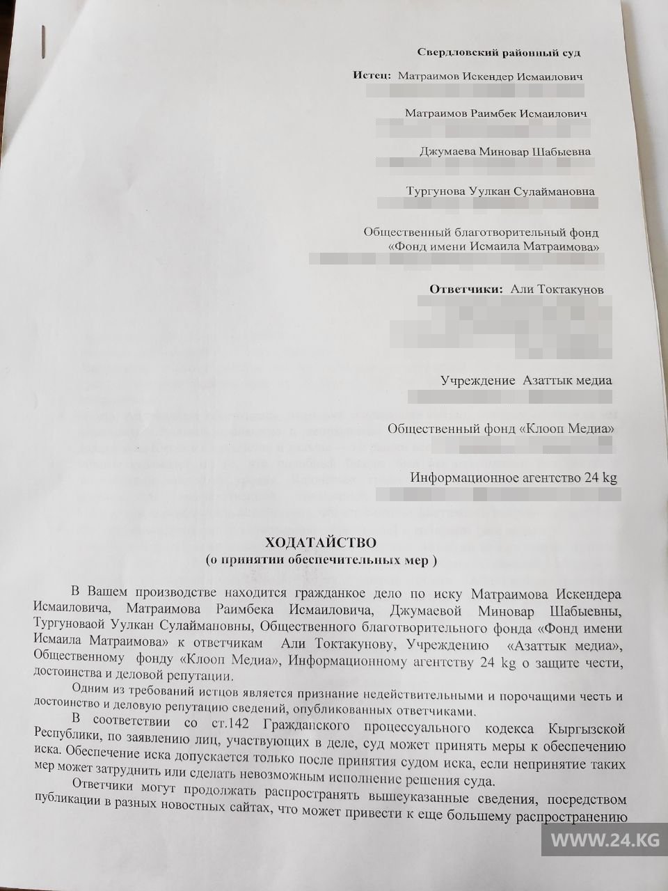 Истцами выступают депутат Жогорку Кенеша Искендер Матраимов, его супруга Миновар Джумаева, экс-замглавы Таможенной службы Райымбек Матраимов, его жена Уулкан Тургунова, а также ОФ «Фонд имени Исмаила Матраимова». Суммы исков о защите чести и достоинства составили: 22,5 миллиона сомов к «Азаттыку», 10 миллионов к журналисту Али Токтакунову, 12,5 миллиона к Kloop, 15 миллионов к 24-kg.com.