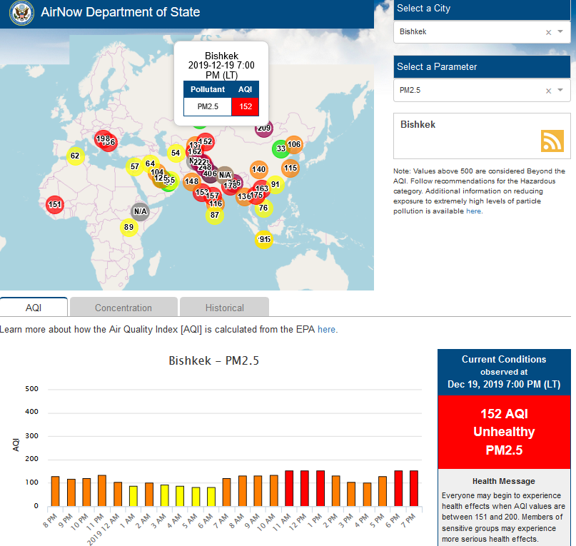 Посольство США в Кыргызстане также установило датчик. Он показывает индекс качества воздуха в режиме онлайн. Информация обновляется ежечасно.