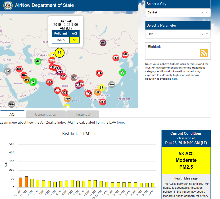 Посольство США в Кыргызстане также установило датчик. Он показывает индекс качества воздуха в режиме онлайн. Информация обновляется ежечасно.