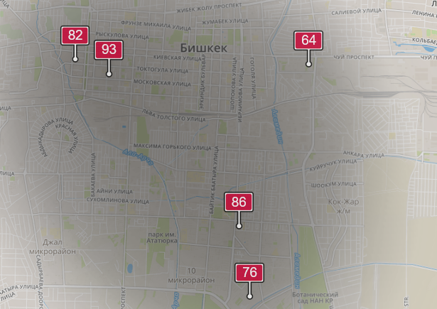 - в районе улиц Бейшеналиевой/Токтогула. Уровень загрязнения не превышен: PM2.5 среднесуточный — 34 мкг/м³, на момент измерения — 82 мкг/м³;