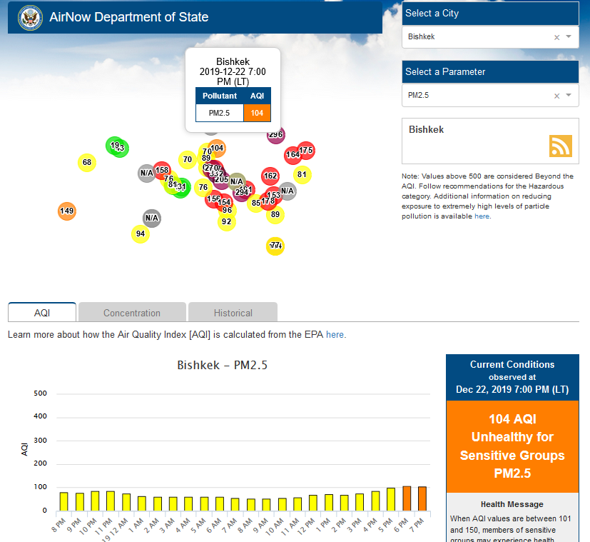 Посольство США в Кыргызстане также установило датчик. Он показывает индекс качества воздуха в режиме онлайн. Информация обновляется ежечасно.