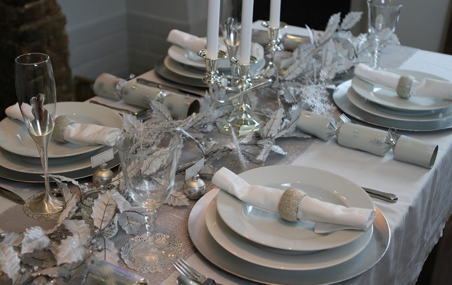 Белая Крыса любит светлые оттенки, поэтому предпочтение лучше отдать именно такой скатерти. Можно добавить посуду с металлическими оттенками, подсвечники, изюминкой могут стать серебристые снежинки. Ну и поставить на стол фигурки символа года грядущего.
