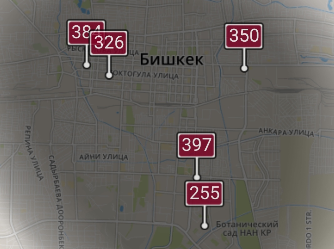 - в районе улиц Бейшеналиевой/Токтогула. Уровень загрязнения превышен в 5,77 раза: PM2.5 среднесуточный — 201 мкг/м³, на момент измерения — 384 мкг/м³;