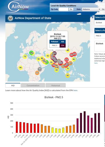 Посольство США в Кыргызстане также установило датчик. Он показывает индекс качества воздуха в режиме онлайн. Информация обновляется ежечасно.