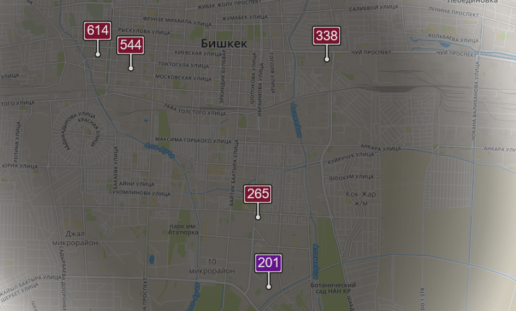 - в районе улиц Бейшеналиевой/Токтогула. Уровень загрязнения превышен в 6,5 раза: PM2.5 среднесуточный — 229 мкг/м³, на момент измерения — 614 мкг/м³;
