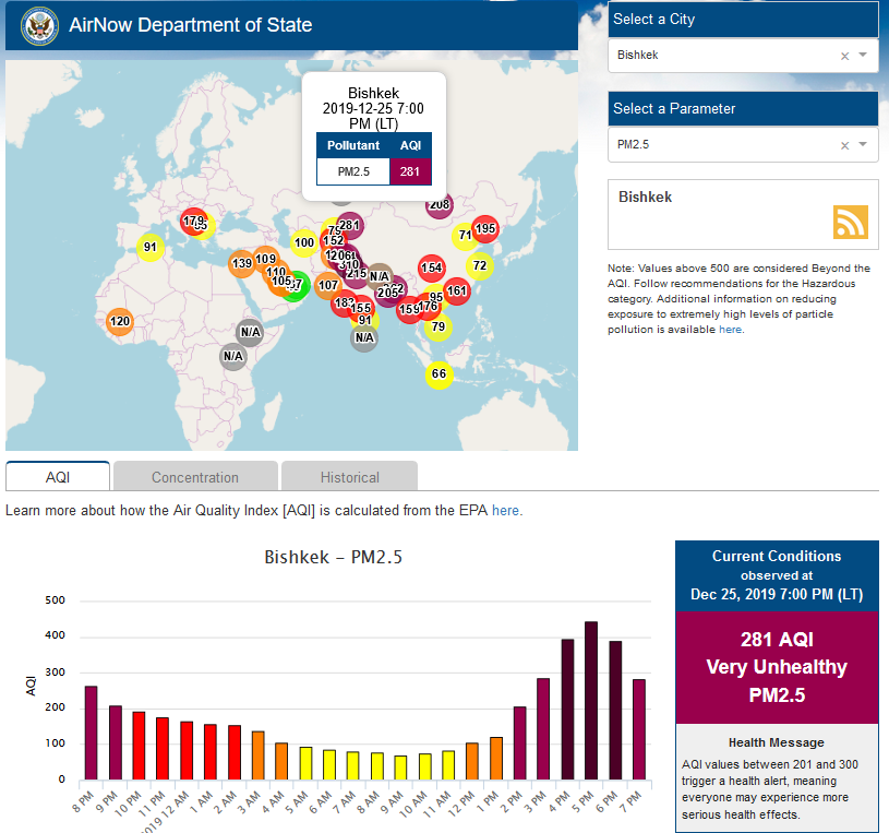 Посольство США в Кыргызстане также установило датчик. Он показывает индекс качества воздуха в режиме онлайн. Информация обновляется ежечасно.