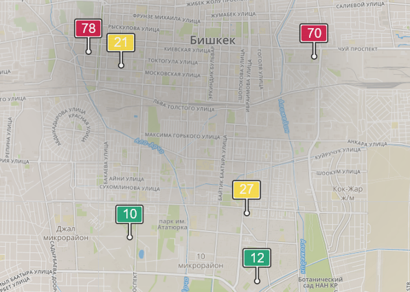 - в районе улиц Бейшеналиевой/Токтогула. Уровень загрязнения превышен в 5,54 раза: PM2.5 среднесуточный — 194 мкг/м³, на момент измерения — 78 мкг/м³;