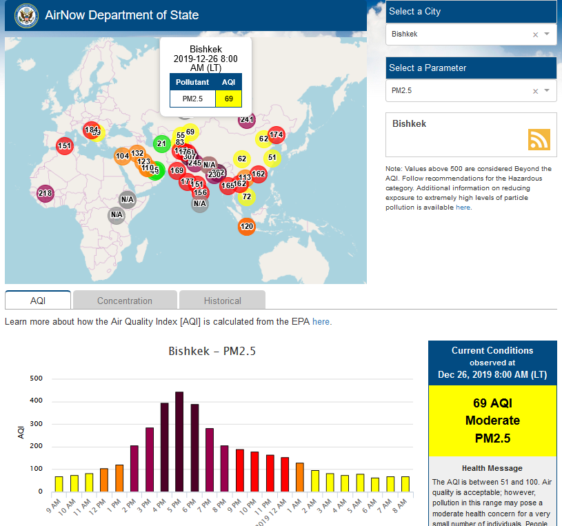 Посольство США в Кыргызстане также установило датчик. Он показывает индекс качества воздуха в режиме онлайн. Информация обновляется ежечасно.